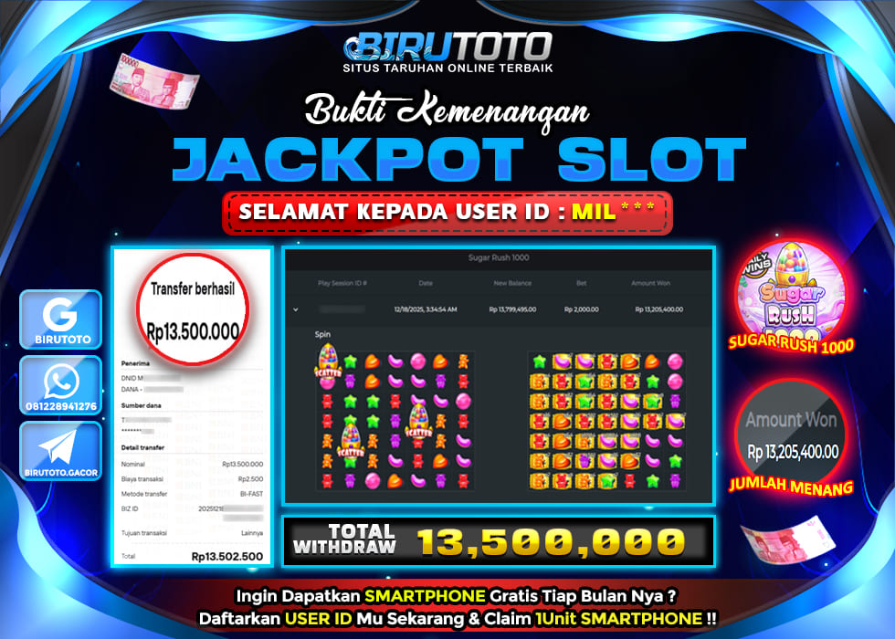 BIRUTOTO JACKPOT SLOT SUGAR RUSH 1000 Rp.13.500.000 LUNAS